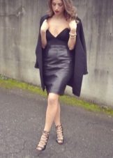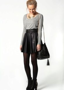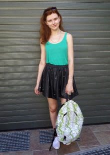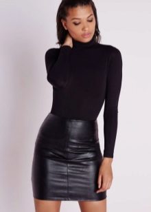 The top to the black leather skirt can be plain and with unusual prints. Such skirts can be worn with blouses, long sleeves, t-shirts, tops or shirts.