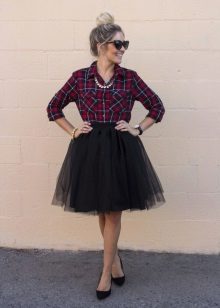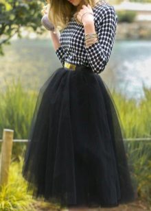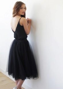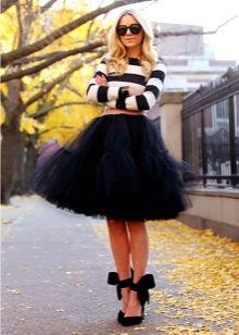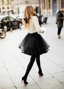 A fluffy black skirt looks good with a delicate blouse, and with a sweater, and with any other top that fits the figure. If it is a guipure or multilayer chiffon skirt, you can choose a top in a delicate pastel palette to it. In cool weather, you can throw a vest or fitted jacket on top.