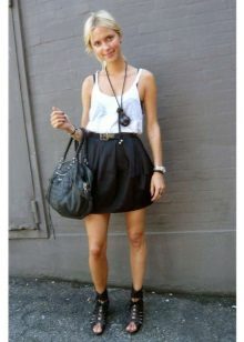 Strict variations of black skirts complement the restrained top, the color of which is most often white or pastel palette. Such skirts are worn with shirts, blouses, cardigans, turtlenecks, thin sweaters, cardigans and jumpers. Shoes are selected depending on the style of the skirt and its length, and the accessories used are often discreet. In everyday use, a black skirt goes well with bright T-shirts, cropped tops, an unusual print top, polka-dot blouses and stripes, massive bracelets, colorful envelope bags or voluminous leather bags. Shoes can be ballet shoes, espadrilles, flat sandals, sneakers and even sneakers.