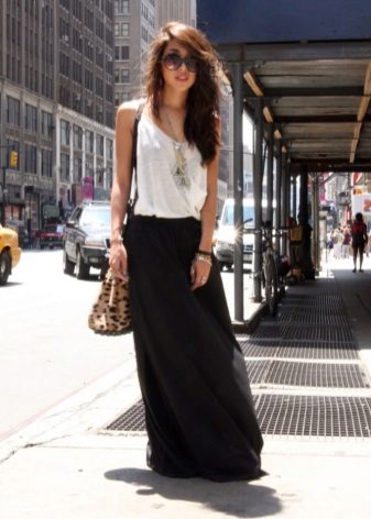 The best addition to a long black skirt is a bright print top such as a striped or flower. For a glamorous look, a long skirt is combined with golden or other expressive tops, as well as with sparkling voluminous jewelry.