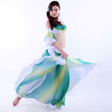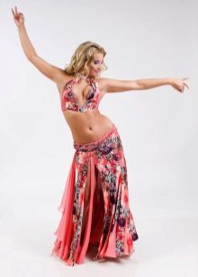 For belly dancing, straight skirts with a high slit located in front on one leg or side are also used. This model fits the silhouette and has an elegant look.