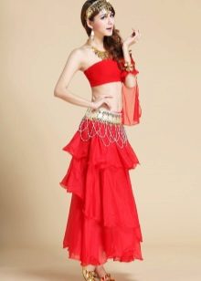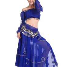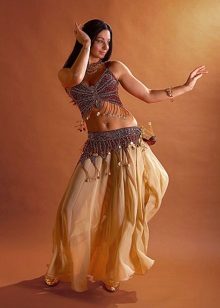 For sewing the skirt used for oriental dances, a suitable thin fabric is selected, then a pattern is created (most often the styles are “sun” or “half-sun”), it is transferred to the fabric and the necessary details are cut out. Next, the side seams are sewn, leaving a place under the zipper. Separately, they cut out the fabric for the belt and strengthen it with non-woven fabric. A zipper is sewn into the skirt and a belt is sewn to it, and then the product is left to “hang” for several days. The final stage of production will be the processing of the seams and, if planned, the sewing of the tape to the hem.