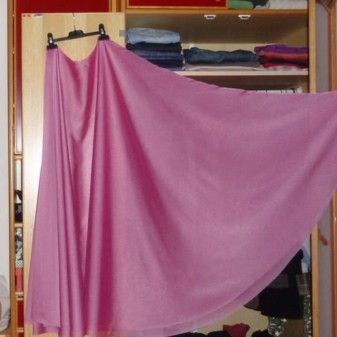 Sewing skirts for ballroom dancing is also often carried out according to the "sun" style. The pattern is transferred to a suitable material, it is cut, and then the side seam is sewn. Often there are several such skirts, for example, the lower of the lining fabric, the middle of tulle and the upper of satin. A separate part is cut from each fabric, then they are applied one on top of the other and sewn together in a belt. The lower edge of the upper skirt is often trimmed with a contrasting color fabric or frill.