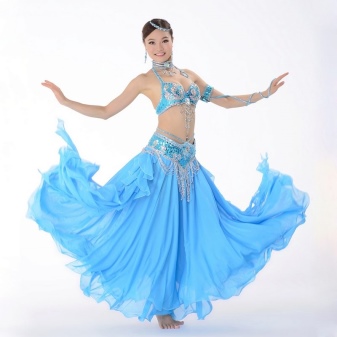 The “sun” skirt for oriental dances is more in demand by slender girls, and when full, they prefer the “year” style. A skirt of such a cut fits the figure in the hips, and then expands.For its sewing, elastic fabrics are used, for example, supplex, knitwear or natural materials with the addition of lycra and other stretch fibers. The expansion of the skirt is provided by stitching 4 or 6 wedges.