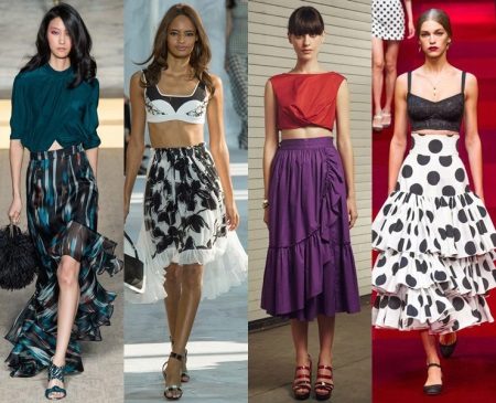 Cotton, silk, chiffon and similar materials are used for sewing summer skirts with frills, and winter models of such skirts are made from dense fabrics. At the same time, business skirts are represented mainly by beige and black models, and everyday models come in any color and with different prints.