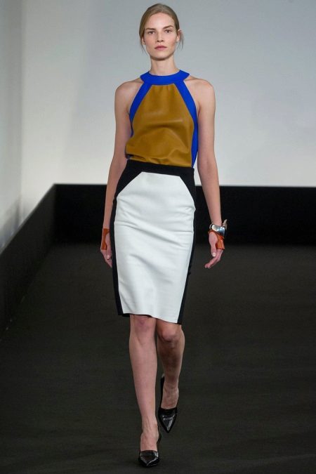 If once a “pencil” skirt was sewn mainly from dense black, gray or other plain low-key fabric, nowadays you can purchase such skirts from cotton, velvet, denim, suede, leather, lace and other materials, and the color can be very bright. Some models also have eye-catching vertical inserts.