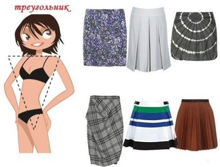 When choosing a skirt for girls whose figure is similar to an inverted triangle, it is advised to pay increased attention to the pattern. On such a figure, models in a cage or horizontal stripes look great, as well as in an oblique line, large peas, large flowers and with a similar print. It is also recommended to choose light skirts, and make the upper part of the ensemble darker. Elements of decor, for example, basque, smell, patch pockets, a belt located on the hips, are also able to affect the perception of the volume of the hips by increasing it visually.