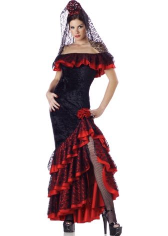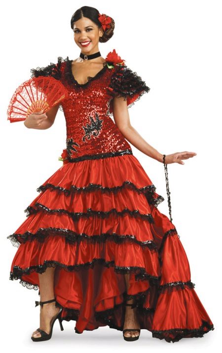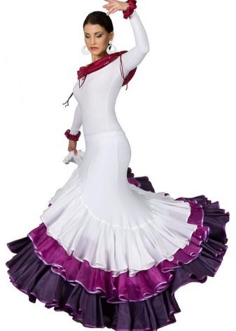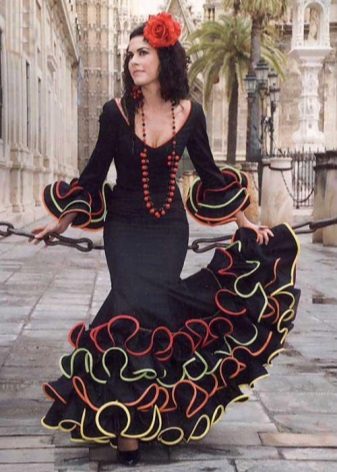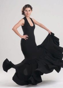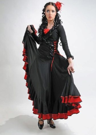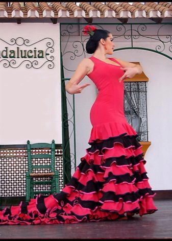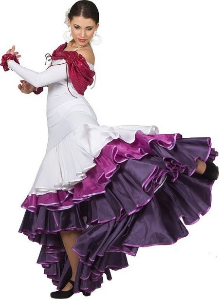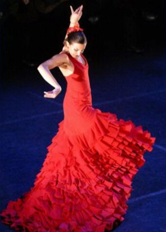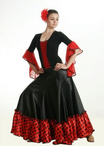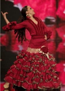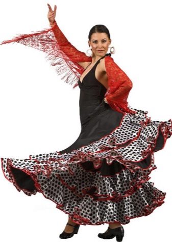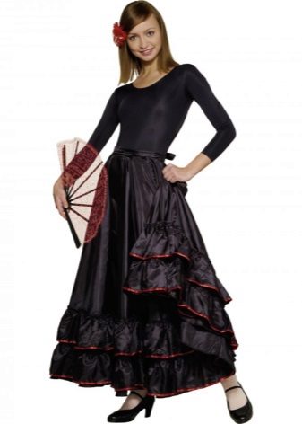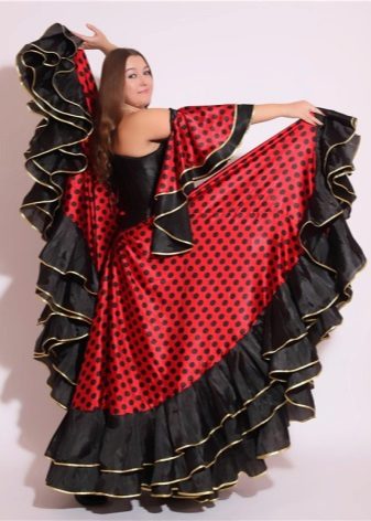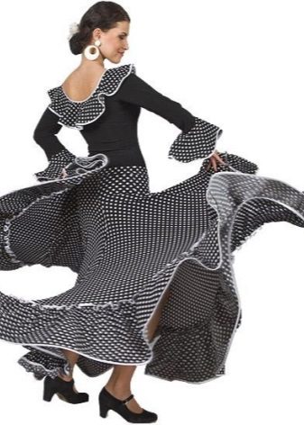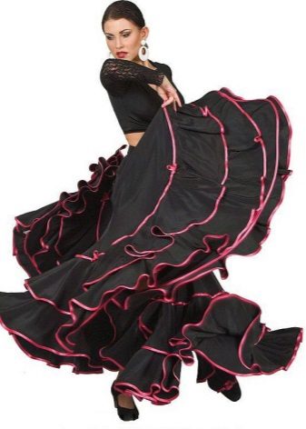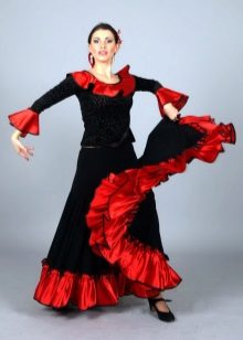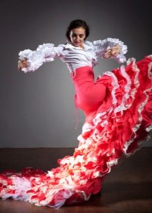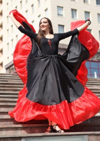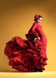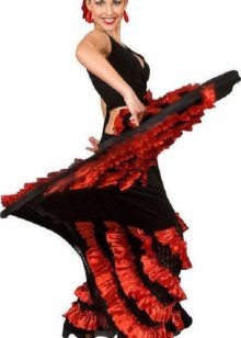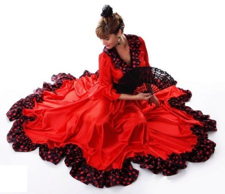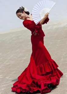 Another option for a Spanish dance outfit is baht. This is a skirt with a long train, or, as it is sometimes called, a ponytail. In this case, monophonic fabrics of deep colors are often chosen for sewing.