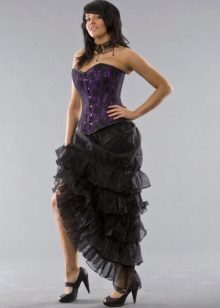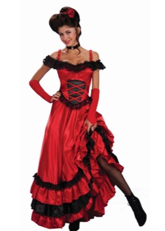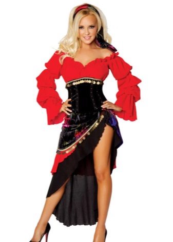 A dress is also called a gypsy costume, in addition to the skirt described above, there is a fully-fitting upper with a deep oval neckline and tight-fitting sleeves, the cuffs of which are also decorated with several layers of flounces.
