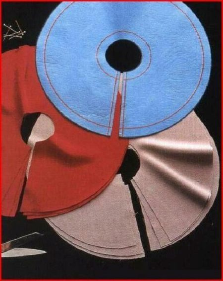 From the base fabric, cut out a circle with a diameter of 150 cm. To do this, fold the dark bard cloth four times and place on a large table. Next you have to make an impromptu compass. They will serve as a lace with a length of 80 cm and a remnant (or crayon). One end of the lace must be attached to the corner of the folded fabric, which accounts for the center. Pull the other end to the edge of the bundle and attach a remnant to it. Sweep from one edge of the folded fabric to the second. So you get ¼ of the desired circle. Unfold the fabric gradually, completing the missing fragments using this technique. Cut a drawn circle.