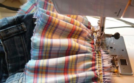 The final chord is the manufacture of the belt. Wrap 50 mm from the top of the skirt inward and bast. Prepare the tape for the belt, cutting off according to the width of the waist plus 4 cm. Attach the upper edge of the skirt to the middle of the tape, stitch and immediately stitch the seam. Bend the edges of the future belt inward twice and sew.