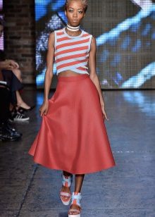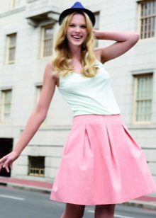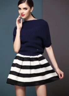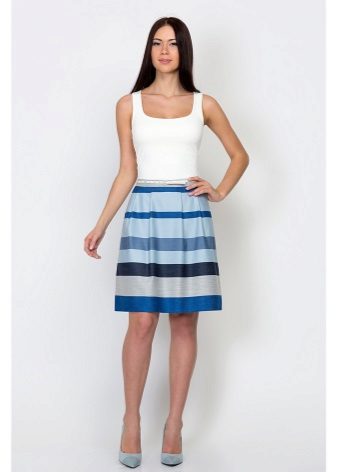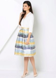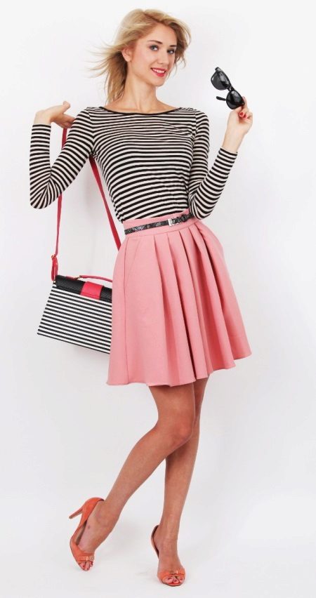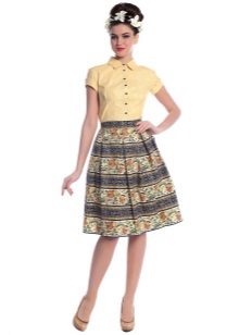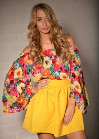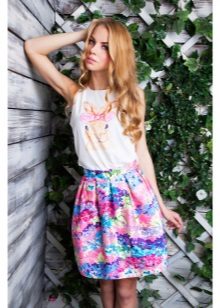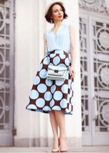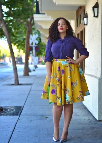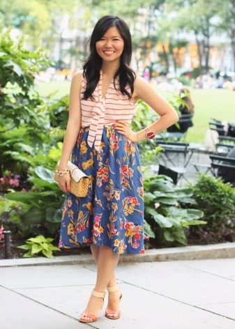 To answer the question of what to wear with a bell skirt with an elastic band, it definitely will not work. It all depends on the length and colors, the variations of which are great today. For example, a motley skirt above the knee will look great with a knitted top or knitted shirt. From shoes you can pick up sandals and grab a small handbag as an accessory.