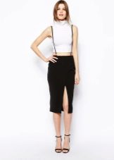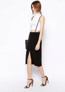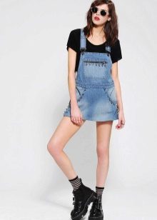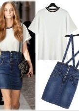 The top to the jumpsuit with a skirt is selected depending on the style and fabric of the product. The semi-overalls are worn with T-shirts, shirts, turtlenecks and blouses. You can choose a crop top, shirt, sweatshirt or bustier for a denim overalls. Strict office models combine with shirts and blouses. In the cool season, a jumpsuit is combined with a jacket or coat.