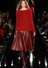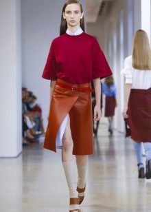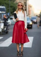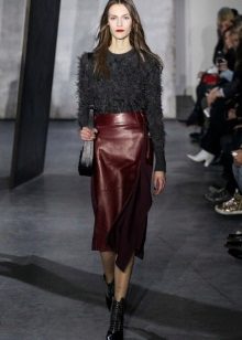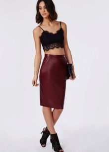 A leather skirt of this shade looks bright and very stylish.It is most advantageously combined with a snow-white top. In addition, a black top, such as a cropped black top or a slim pullover, will be an ideal addition to a burgundy skirt. Also, some girls like to combine such a skirt with a blouse or shirt to match.