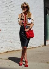 - For a business lady look, combine a leather pencil skirt with a delicate blouse tucked into your belt. Add leather pumps with high heels, as well as a leather bag and an elegant bracelet.