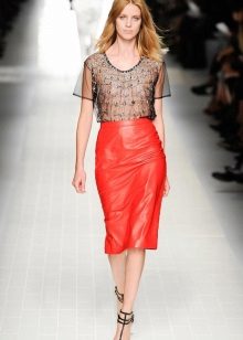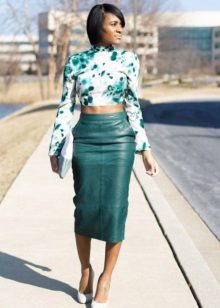 A leather pencil skirt is most often combined with a strict top. For example, it can be a blouse, a man’s shirt, a thin woolen sweater. Girls with a flat stomach often wear this style of a skirt with a cropped top.
