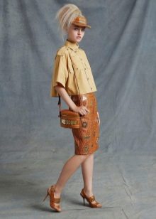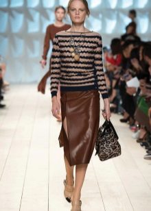 A skirt of this shade is classified as classic along with black. An excellent “companion” to a brown skirt will be a striped top, for example, in black and white stripes. Also, such a skirt combines well with a blue top, which can be represented by a blouse, pullover or denim shirt. The combination of a brown skirt with a sweater or top in a beige shade will also be ideal.