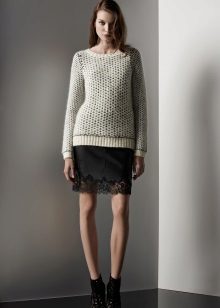 The leather skirt trimmed with lace looks stylish and romantic. Most often, lace runs along the hem of the skirt, creating a lower translucent layer. Such lace can have different widths and densities.