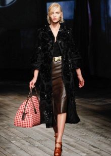 Most often it is presented in the same color as the leather skirt itself, but there are models with lace trim in a contrasting color. Also, lace can be present on leather skirts in the form of a side insert.