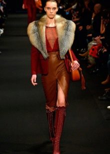 - If you want to create a festive outfit based on a leather skirt, a corset is ideal as a top. A wide belt, a clutch on a chain and silver jewelry, as well as interesting shoes should be selected for him.