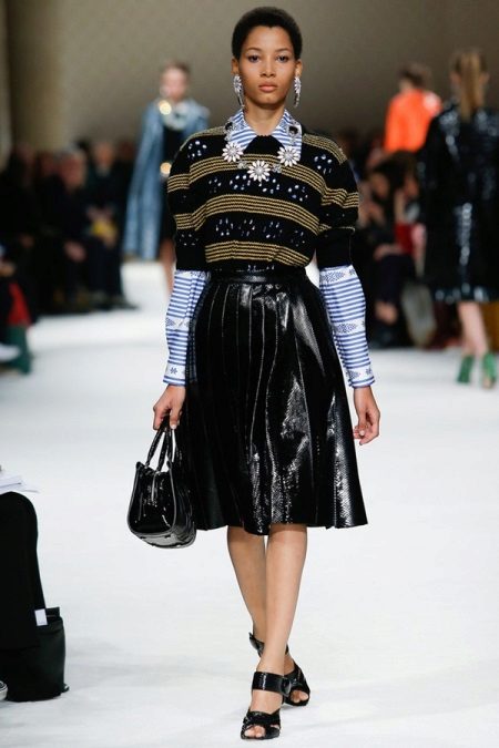 Also there are models with several horizontal stripes. Skirts with diagonal as well as curly leather inserts look interesting.