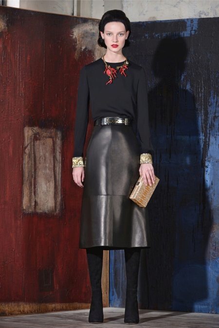 You can also wear a blue, black, or beige top with a red leather skirt.