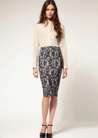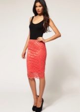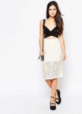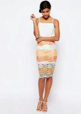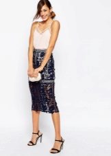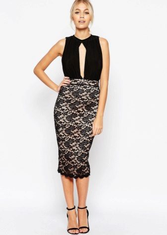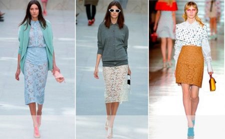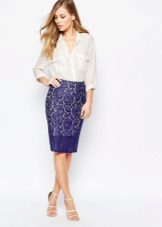 A spectacular lace pencil skirt is perfect for an official meeting, for an informal party, and for a gala reception. The original evening option is a lace pencil skirt with a lining to the middle of the thigh or slightly lower, the rest is transparent. You can add a light, thin blouse made of silk and the evening look is completed.If instead of a blouse, you use a plain top with a jeans shirt thrown over it, then you can get a great option for every day.