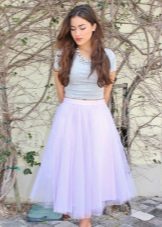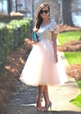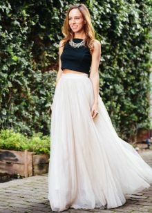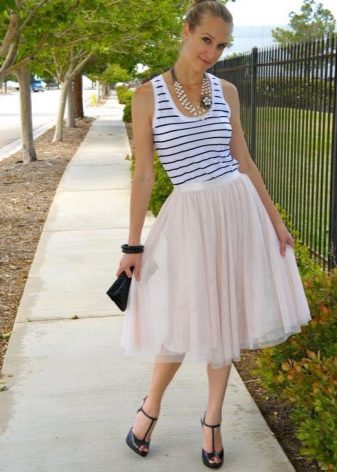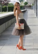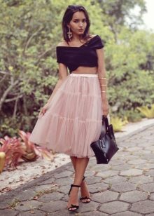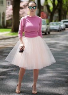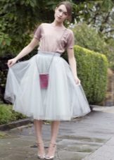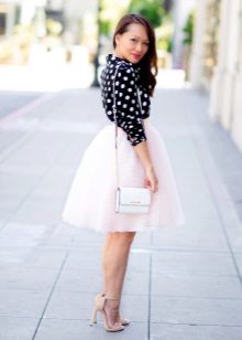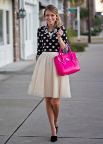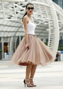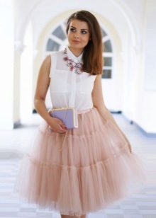 Such skirts can be combined with things from everyday wardrobe: simple T-shirts, tops, denim shirts and jackets, cardigans, thin sweaters. In a beige tutu skirt, you can go to study, to the theater, to the opening of an exhibition or to a party. For special occasions, you need to choose a more elegant top, sewn from high-quality, noble fabric.