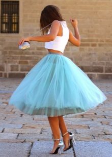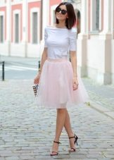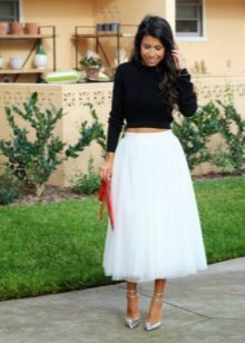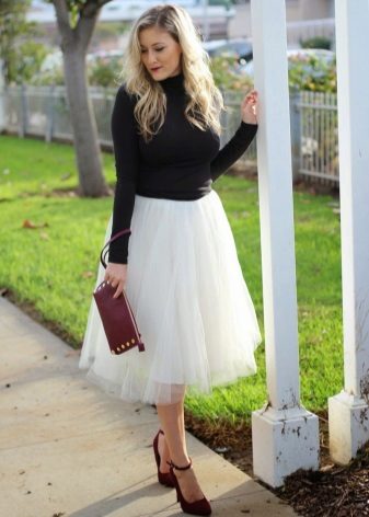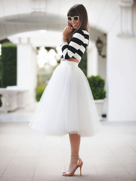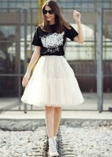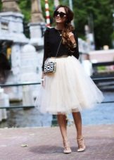 In a traditional white color, a tutu skirt looks very advantageous, largely because it is combined with clothes of any color. Therefore, choosing the top for this beautiful skirt, you can safely experiment with the color scheme, in search of the most successful and bright combinations. Pay attention to things in saturated colors - they make a favorable contrast with the delicate whiteness of a tutu skirt.