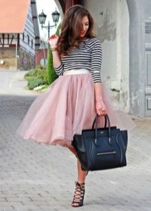 - A fluffy skirt of exquisite, dusty pink color with a mischievous vest, black sandals (thanks to the thin straps around the ankle, they resemble ballet pointes) and a large bag in the tone of shoes.