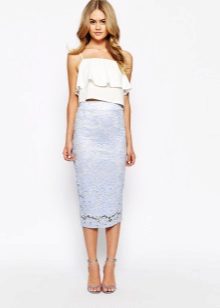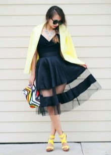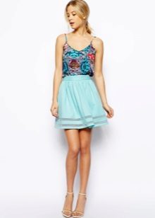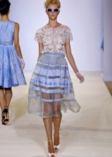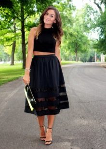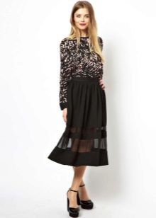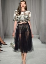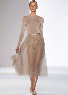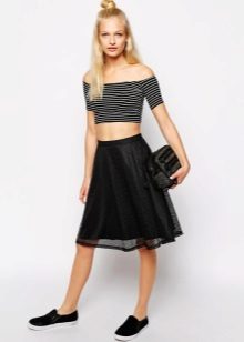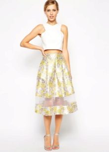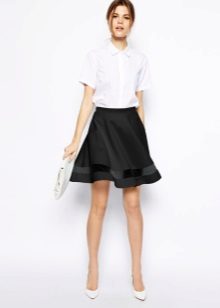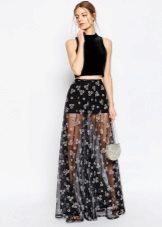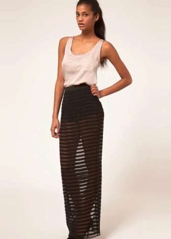 The top to a transparent skirt is better to choose contrasting colors, the style is as restrained as possible. Light blouses and tops will be very useful here. If a skirt with a high fit at the waist, then it will be appropriate to fill the top of the skirt.
