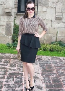 A black skirt is an essential element of a formal business style. Such a skirt looks strictly and restrained, and an interesting detail in the form of a peplum will help soften the perception of your image. A puffy peplum over a narrowed skirt makes the look more playful. You can enhance the effect with a bright strap at the waist.