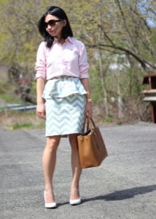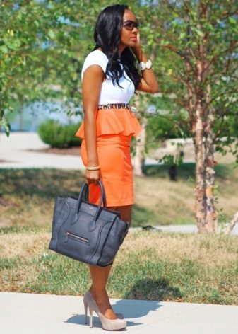 A peplum skirt is a very feminine and elegant thing, so you need to wear it with appropriate things. Shoes are best chosen in the classical style - shoes, sandals, high heel shoes, ballet shoes. Beloved by many girls, boots with wide legs or comfortable sneakers will not work here. There can be any bag, but it is better to give preference to elegant, “adult” models, for example, a small bag on a chain or on a strap, a clutch, an envelope, a baguette, etc.