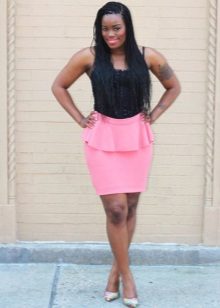 - For full beauties, the most appropriate style of peplum skirts would be a model at a high waist. The upper part of such a skirt is usually made of dense fabric, therefore, acts on the principle of a corset. To look perfect, it is recommended to wear a similar outfit with corrective underwear.