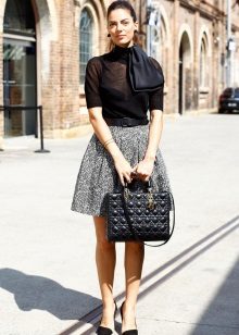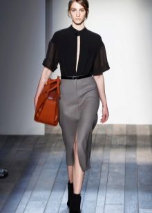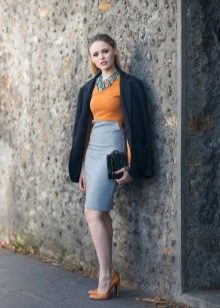 It is necessary to abandon the decor, luxurious expensive jewelry will help to decorate the silhouette. A light gray skirt with a dark gray blouse to create an office look looks beautiful. To add colors, you can take a bright handbag.