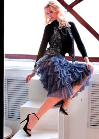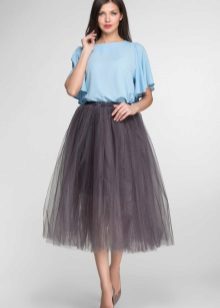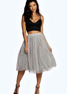 For the embodiment of a romantic look, it is worth giving preference to a gray fluffy skirt to the knee. She perfectly harmonizes with feminine blouses.