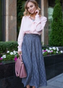 To match the dress code and show your individuality, with a gray midi-length skirt you can wear the top of bright colors, as well as decorate the silhouette with luxurious bows.
