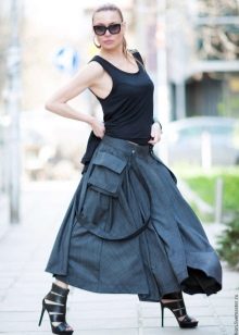 A gray maxi skirt made from flowing fabrics is an excellent solution for creating a romantic look. It looks beautiful with a bright top and unusual accessories. For a walk or meeting with friends, you can put on the upper in green-brown tones. This silhouette looks simple and fashionable.