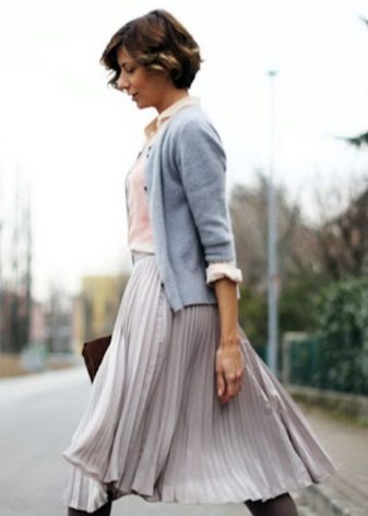 A pleated gray skirt looks great with a fitted top. In the cold season, you should pay attention to a short leather jacket. In this outfit, you will always be at your best under any circumstances.