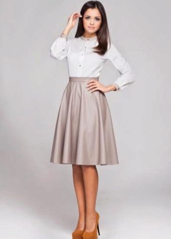 For an office look, a gray skirt will be a good choice. With it you can wear a bright blouse, and at the same time match the dress code.