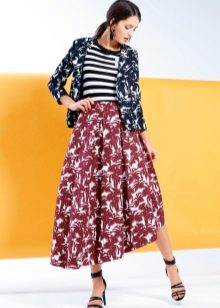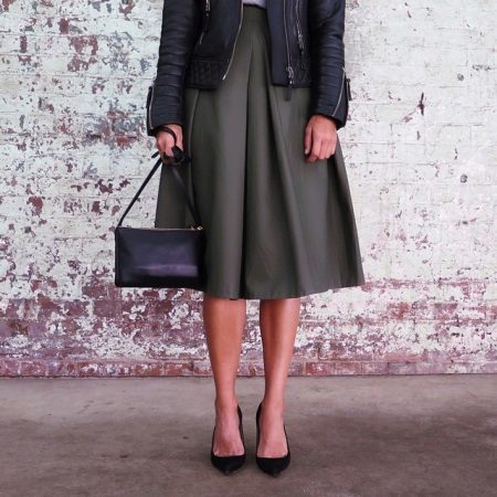 Any skirt, including those with oncoming folds, looks best together with high-heeled shoes. Therefore, you can combine it with office shoes, sandals, boots or high-heeled boots.