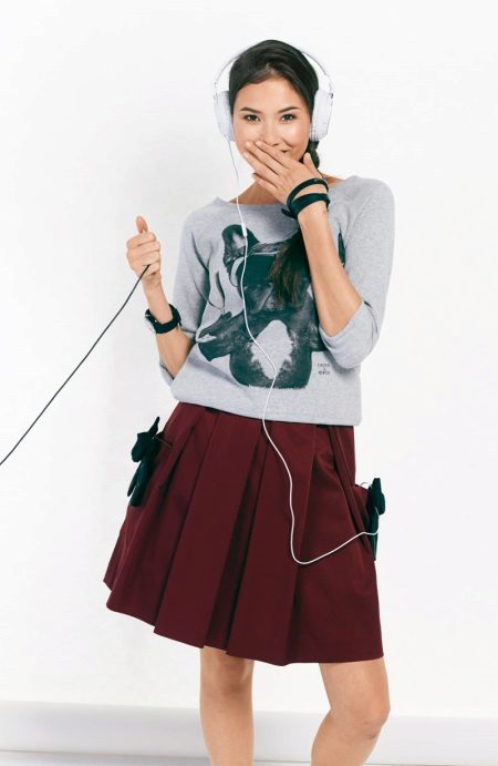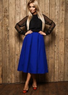 The skirt with oncoming folds looks very elegant and a little flirty. It can be combined with things in a variety of styles: it all depends on the model and material of the skirt itself.