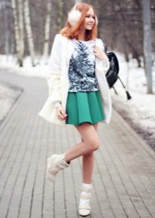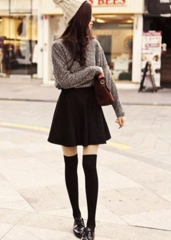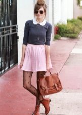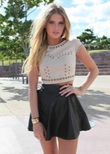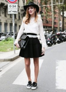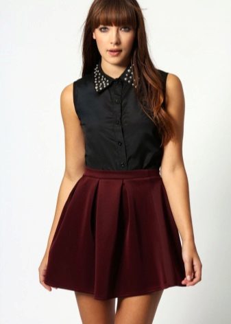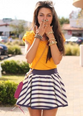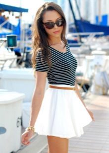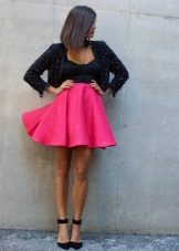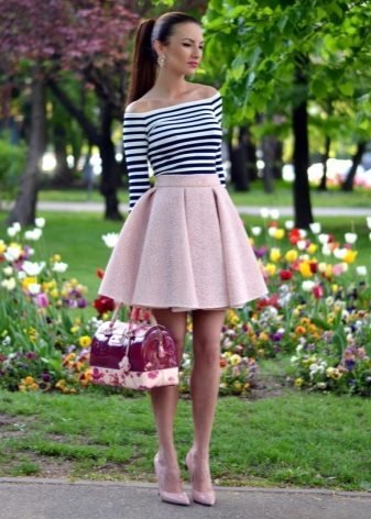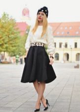 But when choosing an accompaniment to a flared skirt, it is necessary to take into account the material of the product. If the skirt is sewn from thin fabric, a light top, a simple knitted T-shirt, a light shirt or blouse will suit it. A bolero, denim jacket or casual cardigan can be thrown over.