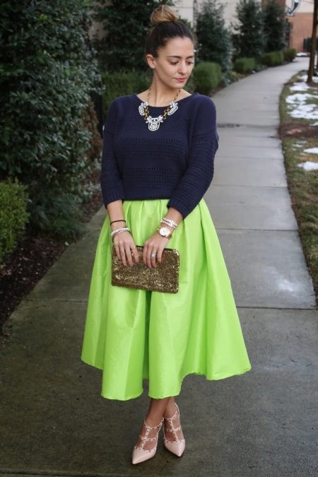 In general, slender, tall enough girls do not need to be afraid of flared skirts, since she cannot ruin such a figure. Low ladies should carefully choose the length, since an excessively long skirt will visually make them even lower.