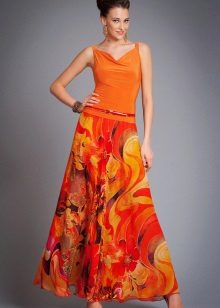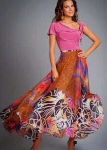 A skirt-sun in the floor of a thin, flowing fabric looks very beautiful, especially if an expressive color scheme consisting of rich, rich shades is chosen. Multilayer models resembling gypsy skirts look more extravagant.