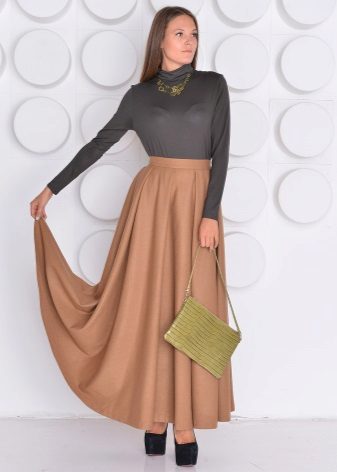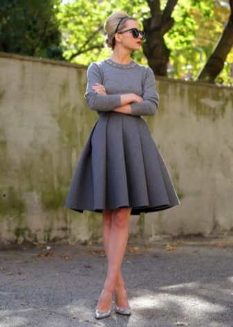 Due to the high fit of the skirt, the waist looks narrower than it really is. A flared skirt in combination with an accentuated waist makes the proportions of the figure more harmonious.