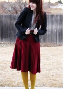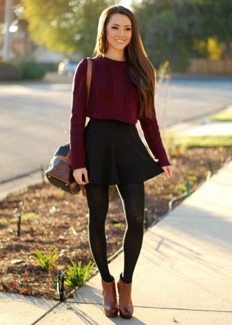 In the cold season, many girls are happy with the opportunity to wear bright tights, stockings and knee-high socks. They not only prevent freezing, but also give the image a little playfulness and mischief. Cropped and midi skirts go well with these wardrobe items.
