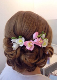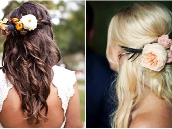 A casual look can be supplemented with a small hairpin with a flower, fixing locks on the back of the head. The contrast of monochrome shades looks no less attractive. Black and white flowers can alternate on a hairpin.