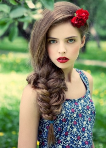 Hairstyles with braids decorated with flower hairpins are in fashion. If the braid is voluminous, the accessory should be large. It can be located at the place of attachment of the braid, it will look stylish on the head with a twisted braid.