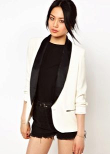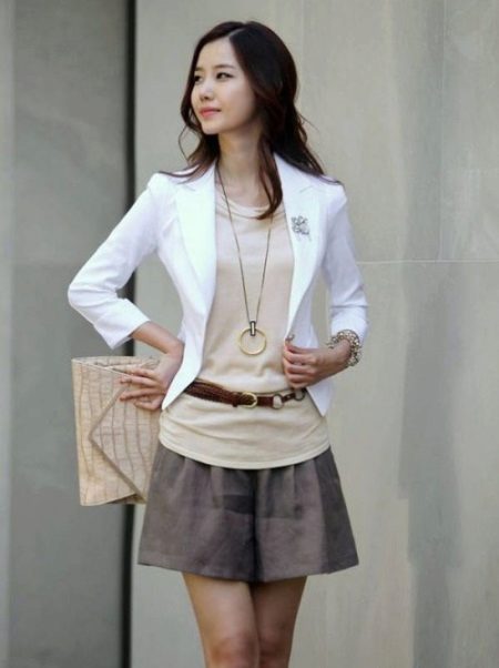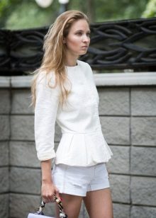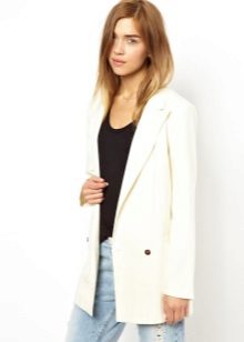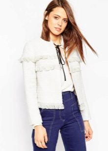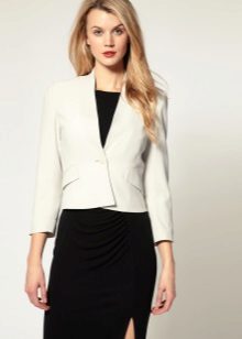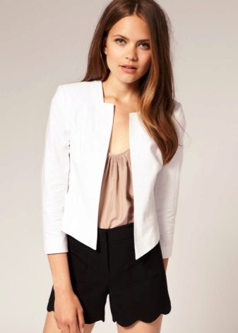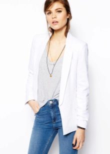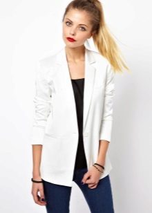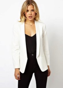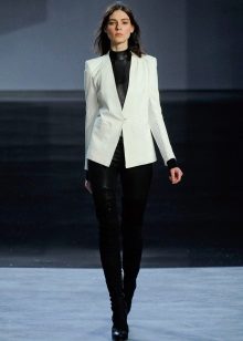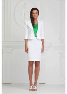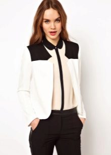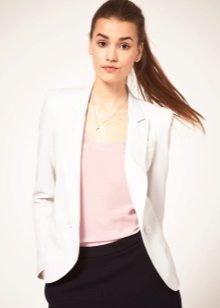 To create a strict, business style, a white jacket can be worn with a trouser suit or a set of blouses and pencil skirts. The color scheme of the costume in this case is desirable classic. The outfit is complemented by high-heeled shoes or neat boats.